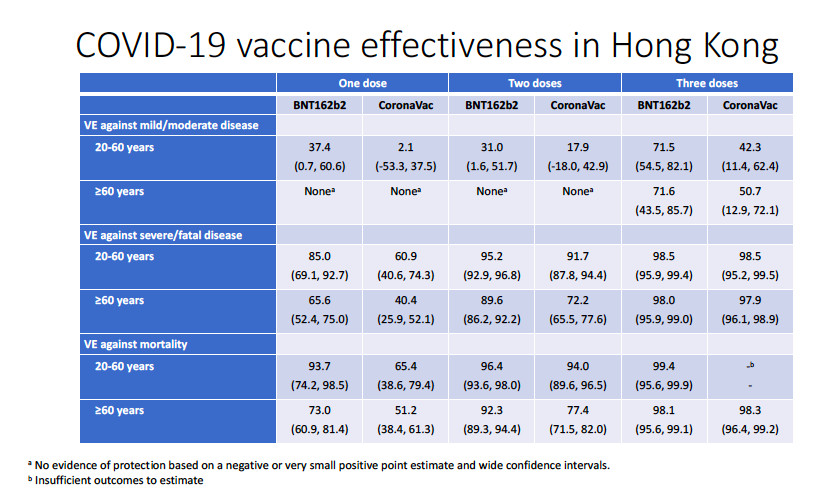 3月22日,香港大學李嘉誠醫學院發佈了一份名為“香港第五波疫情的前瞻性規劃”的研究,其中一組來自香港的疫苗有效性數據顯示,對於60歲以上老人來説,接種三劑次的科興和復必泰(BNT162b2)疫苗,防重症、防死亡的有效率,都超過了90%。