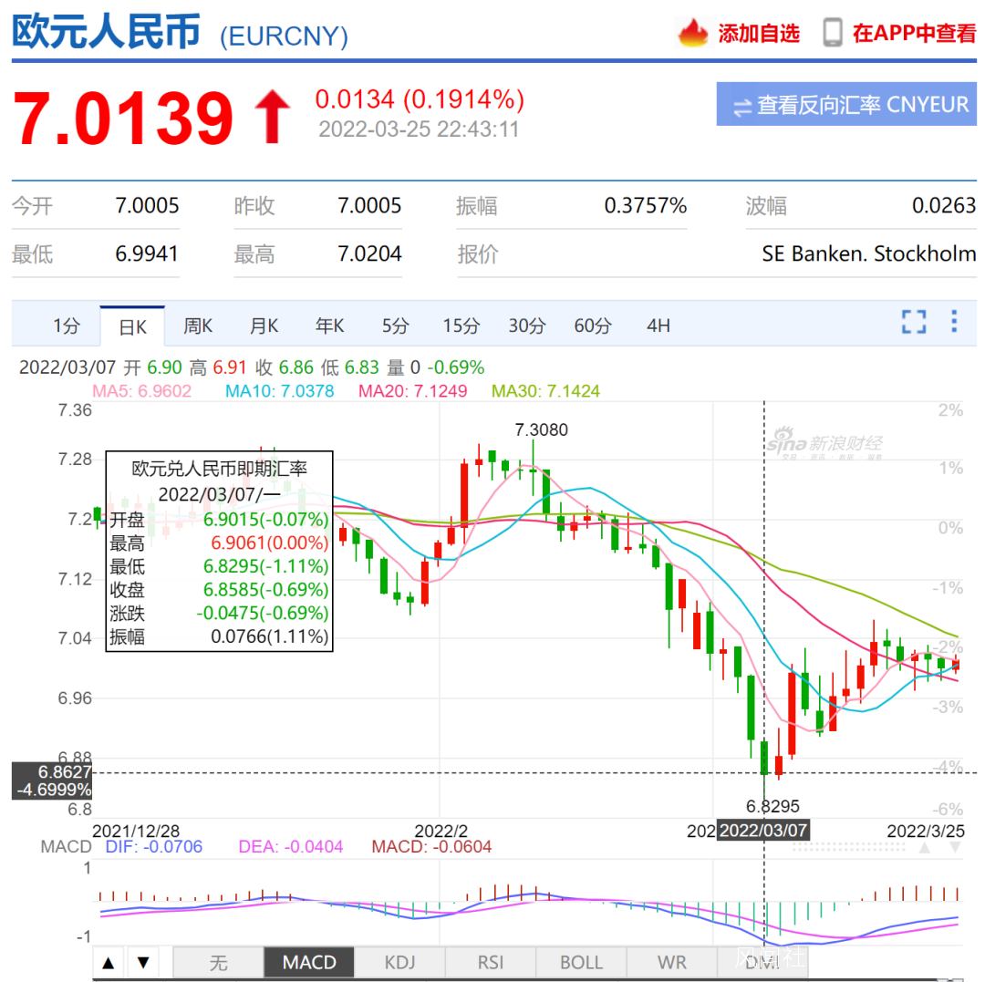 歐元對人民幣匯率持續下跌,3月7日甚至跌至6.82。