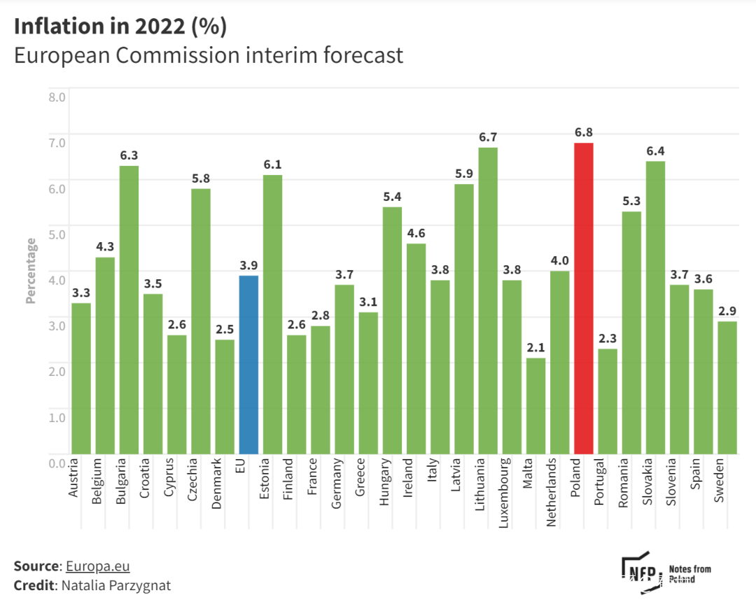 根據歐盟委員會的新預測,波蘭今年的通脹水平將在所有歐盟成員國中最高。
