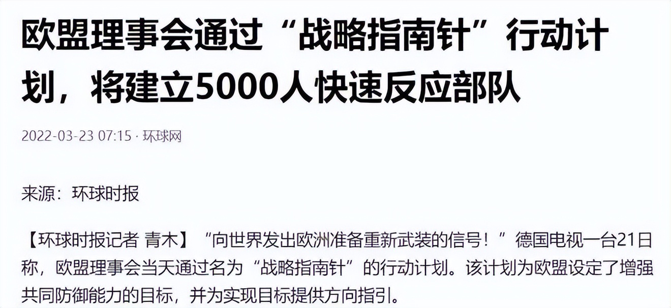 我再給出一個消息,就在歐洲緊跟美國製裁俄羅斯的同時,3月21日,歐盟理事會通過了一個名為“戰略指南針”的行動計劃,根據計劃,未來歐盟將建立一支最多由5000人組成的快速反應部隊,這就是馬克龍極力推動的“歐洲軍”。
