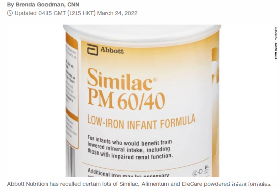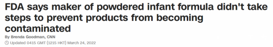 美國食品和藥物管理局(FDA)在1月31日至3月18日期間,對雅培公司(Abbott Nutrition)生產工廠進行了檢查,發現該公司生產工廠衞生條件未能達標,不能確保配方奶在生產過程中不受污染。
