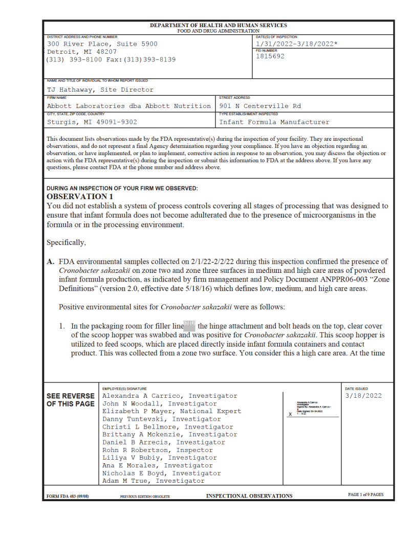 報告中寫滿了該工廠到處都可以檢測到克羅諾桿菌的致命細菌****(包括****坂崎克羅諾桿菌******)**。(FDA給出的表格483並不代表該機構對有可能違規行為的最終判決。)