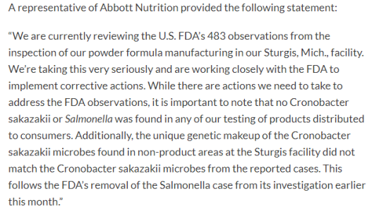 “我們目前正在分析美國食品和藥物管理局(FDA)對我們密歇根州特吉斯工廠的奶粉生產進行檢查後發佈的483表格內容。對此結果,我們非常重視,並且我們正積極配合FDA調查,實施整改措施。雖然我們對FDA給出的結果努力的採取行動整改,但是重要的是,目前值得注意的是,並未在銷售給消費者的產品測試中發現坂崎克羅諾桿菌和沙門氏菌。此外,在斯特吉斯工廠(Sturgis facility)的非生產區發現的坂崎克羅諾桿菌的獨特基因組成與報告病例中的坂崎克羅諾桿菌並不匹配。在此之前,FDA已在本月早些時候將(我們產品)沙門氏菌案從調查中移除。”