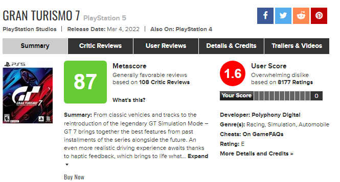 以上就是製作人山內一典代表GT開發商對玩家輿論問題做出的反應。而從眾多玩家的角度來看,他們似乎並沒有要做改變的意思。玩家們當然不會對這個回應領情,而這種不滿的情緒就這樣展現在了Metacritic上的用户評分上。