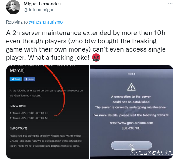 而GT7從17日開始,毫無徵兆的停服了30多個小時,直到18日早,玩家下載完更新,此時遊戲依然處於離線狀態。