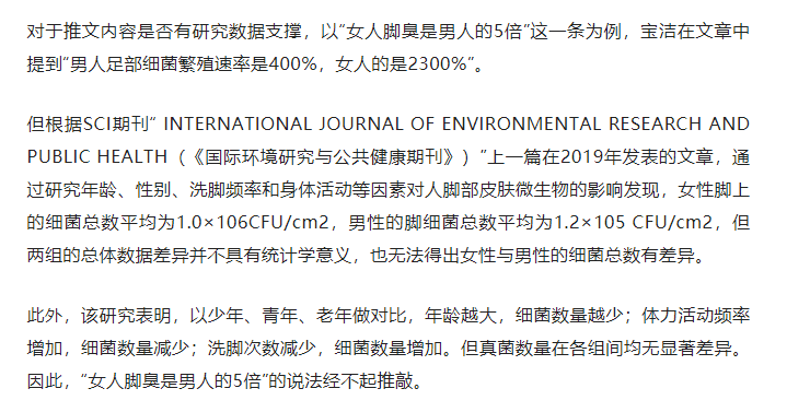 還有人甩出SCI期刊文章,證明(腳上)真菌數量在各組(男性與女性)間均無顯著差異,實力打臉偽科普。