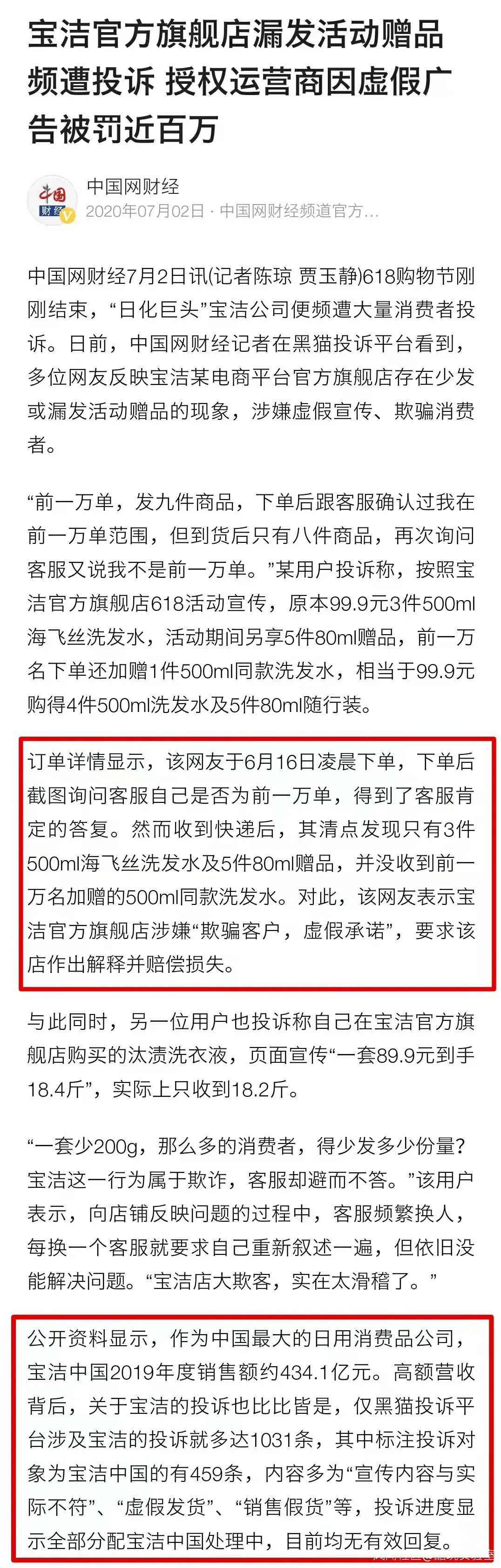 在黑貓投訴裏,與寶潔有關的投訴超過2000條, “海飛絲越洗頭屑越多”“退貨不退款”“漏發貨品,多次溝通,不補發不退款”的質疑從未間斷,但寶潔在2019財年依然拿下了676億美元的營收,其中,中國市場貢獻了近三分之一的營收增長。
