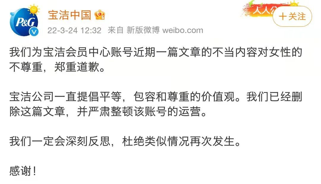 眼瞅着官微都被衝了,寶潔很快出面道歉:對不起,深刻反思,已開除臨時工。