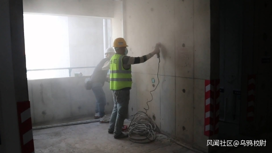 以牆壁打磨為例,牆壁水泥硬化後需要打磨平整,傳統打磨方式是人工打磨,打磨機與牆壁“親密接觸”不到10秒,周圍幾米的範圍內即完全被粉塵淹沒,工人們近在咫尺也相互看不見。