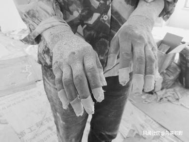 在悶熱的房子裏工作一個小時後,她扶着牆歇口氣,此時她幾乎成了“雪人”,身上一抖,粉塵飛揚。由於流了很多汗,她臉上和手上的粉塵已經和着汗水黏在一起。