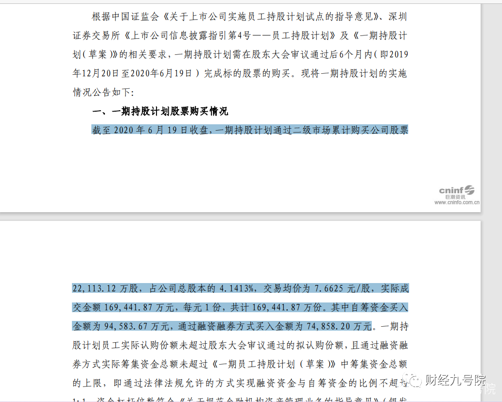 截至 2020 年 9 月 22 日收盤,二期持股計劃通過二級市場累計購買公司股票3730.64 萬股,交易均價為 9.725 元/股,實際成交金額 36281.74 萬元,其中通過融資融券方式買入金額為 17526.79 萬元。