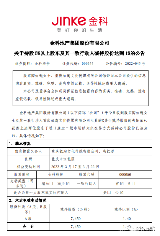 3月23日晚間,金科股份(SZ000656)發佈《關於持股 5%以上股東及其一致行動人減持股份達到 1%的公告 》。