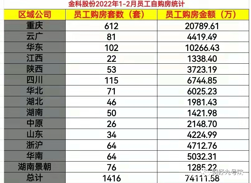 而據克而瑞地產研究中心的數據,今年前兩月金科股份全口徑銷售額才148億元,員工購房就佔了20分之一!