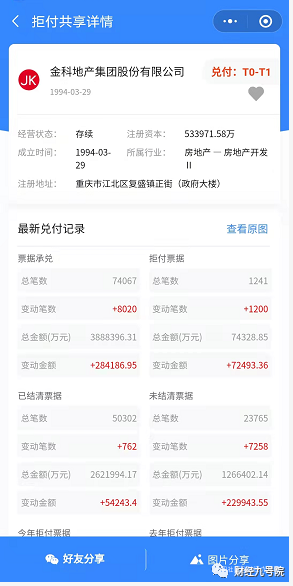 據媒體援引商票第三方平台“票眼”小程序的數據稱,金科股份今年又新增了1200筆拒付商票,累計拒付金額7.2493億元。