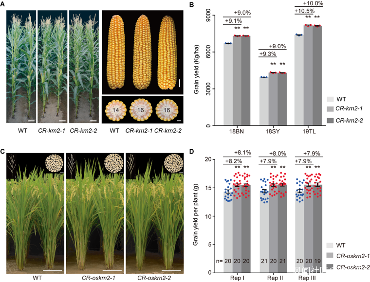 該論文發現,玉米KRN2和水稻OsKRN2受到趨同選擇並通過相似的途徑調控玉米和水稻的產量。通過多年多點的田間小區試驗表明,**玉米KRN2敲除系和水稻OsKRN2敲除系可分別提高10%的玉米產量和8%的水稻產量,**並且對其他農藝性狀沒有明顯的負面影響,展現了巨大的應用潛力。