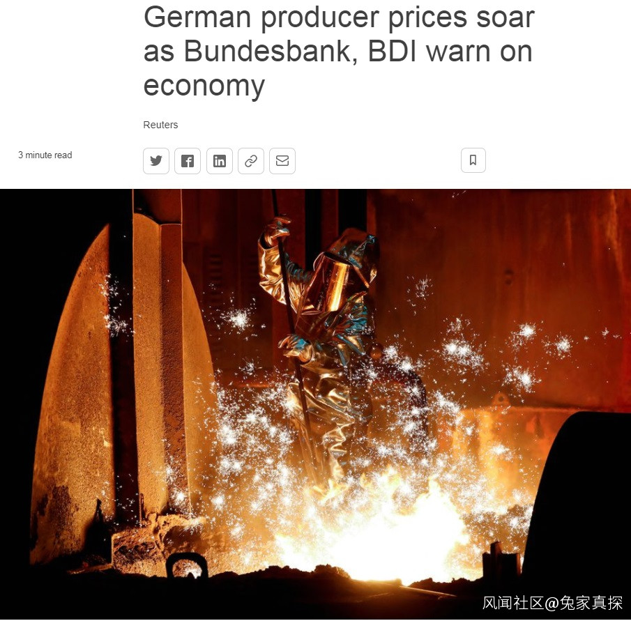 路透社:德國 1 月份生產者價格以有記錄以來的最快速度上漲,飆升 25%,並延續了一系列大幅上漲,可能會使企業承受財務壓力和高消費通脹。