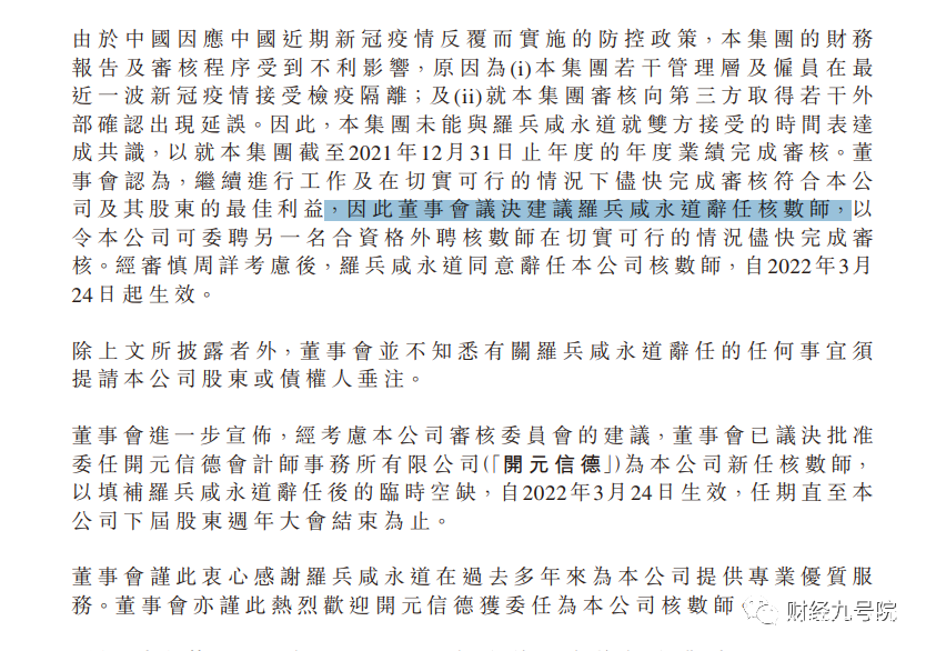 其次是:“提供所要求的跟進資料,以及發出及接受多筆銀行及其他賬款結餘的確認已因中國近期新冠肺炎疫情反覆影響而進度落後,而羅兵鹹永道考慮進行額外工作。”第三點原因才是疫情影響時間。