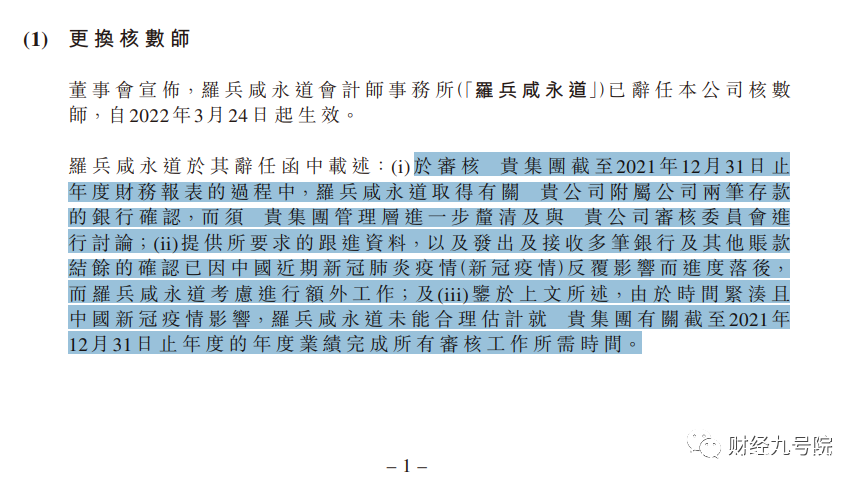羅兵鹹永道在辭任説明中的説辭,或許已經透露了真實原因。辭任的第一條理由即是:“於審核貴集團截至2021年12月31日止年度財務報表的過程中,羅兵鹹永道取得有關貴公司附屬公司兩筆存款的銀行確認,而須貴集團管理層進一步釐清及與貴公司審核委員會進行討論;”
