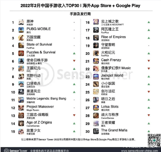 據Sensor Tower平台數據顯示,今年2月三七互娛旗下三消+末日題材遊戲《Puzzles & Survival》表現搶眼,成功殺入當月國產手游出海收入榜Top 5。另一家廠商麥吉太文面向女性市場的三消+換裝產品《Project Makeover》則穩居榜單第12位,公司也憑遊戲的出色表現力壓樂元素位列2月中國手遊發行商收入榜第16位。