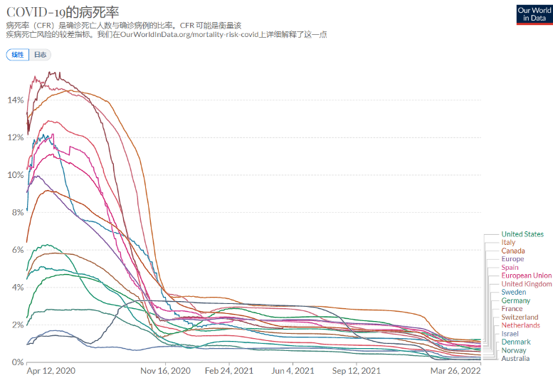我們可以明確看到,從疫情開始以來,這個死亡率有明顯的三個連續下降的階段。原始菌株統治下的第一階段到2020年10月為止,西歐國家的平均死亡率應該在8%上下。接下來的Delta變種為代表的第二階段到去年底為止,平均死亡率大概在1.7%上下。最後的Omicron階段的平均死亡率則下降到0.7%左右。