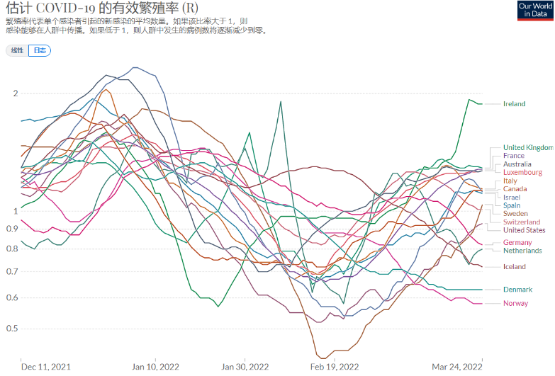 這個數據只更新到到3月21號。圖列各國,除了突然離線暴起的愛爾蘭例外,所有國家現在的R值都在0.63和1.36之間。可惜沒有一個勻值。在1以上的有9例,1以下的有8例。趨勢明顯上升的有愛爾蘭、以色列、加拿大3例。明顯下降的有意大利、瑞士、德國、冰島、荷蘭5例。其餘9例大體持平。綜合起來,西方的這個R值就是在穩中有降,近期應該不會像2月中那樣驟升了。