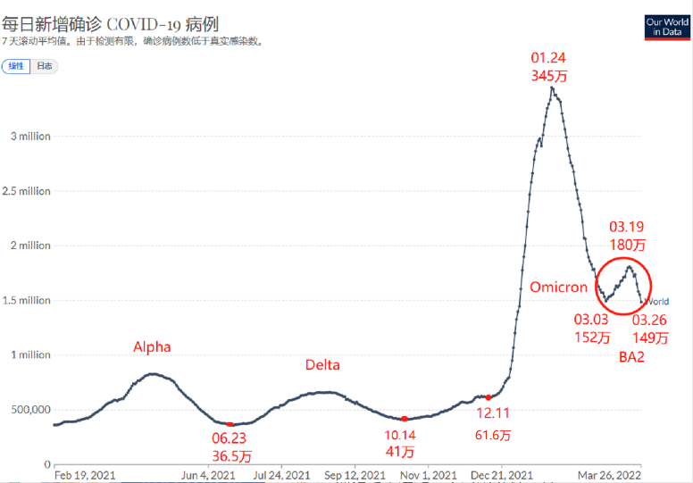 先上一個全局圖。上面只有一項數據,就是從2021年3月1日以來的全球新增確診病例的七日滾動平均數。圖中加了三項標註,分別是:毒株名稱、日期和新增確診數。紅圈處是重點分析的BA2小週期。