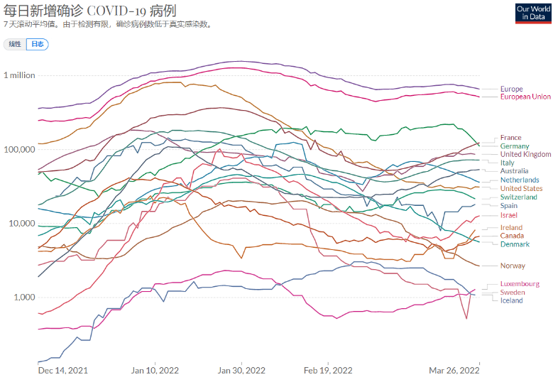 這第二圖表達的是西方17個國家加上歐洲和歐盟兩個集體共19個項目的七日滾動平均新增確診絕對數。這回由於所有案例都重要,只好用對數。從最上面兩行,可以清楚地看到,無論歐洲還是歐盟,其總數比起上一波的峯值已經下降很多,但從3月3號開始,又都開始反彈。所幸這個反彈很快結束,從19號開始,歐洲/歐盟的總數,重新開始下降。具體一點,上一波疫情歐洲的起點是去年12月15日,谷值36.6萬。上一個歐洲的峯值是1月30號的156萬。45天,升426%!最近一個谷值是是3月3號的56萬。降32天,谷值是峯值的36%。這個下降週期被BA2打斷。3月20號小峯值是75.8萬。升17天,小升幅是35%。