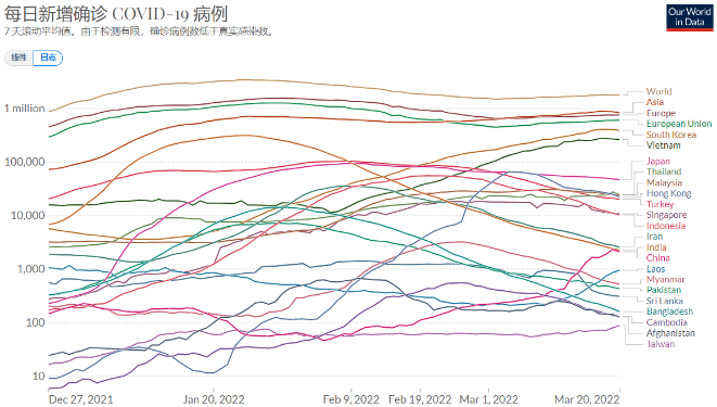 亞洲的Omicrion疫情總趨勢,去年12月下旬從日增總數7萬稍遲起,到1月25號登頂72萬底登頂,2月27號小谷底55萬。3月17第二峯值88萬。以後一路下行,現值大約70萬。這個總數已經和歐洲並駕齊驅(左圖)。但是如果按人口加權,歐洲的疫情就是亞洲的八倍了(右圖)。