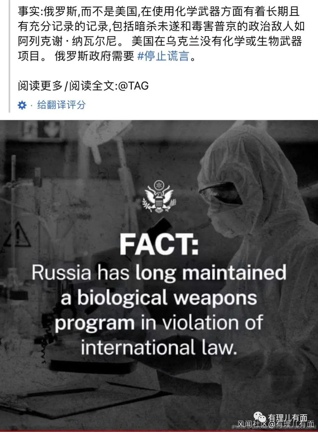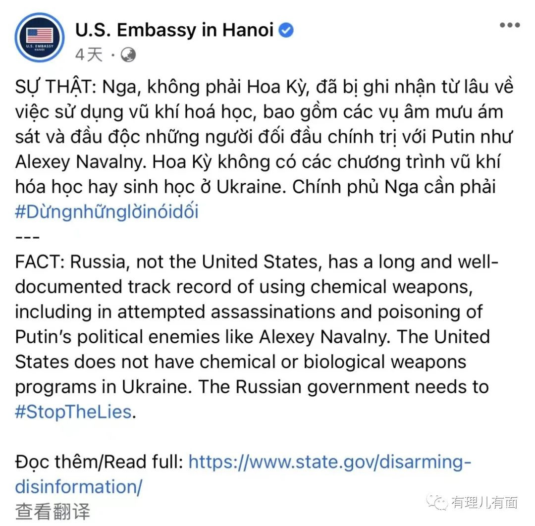 自俄羅斯政府曝光美在烏克蘭的生化武器實驗室後,美國國務院便通過使領館展開了一輪“闢謠”工作。美國稱自己在烏克蘭沒有生化武器,並稱俄羅斯才是使用生化武器的慣犯。