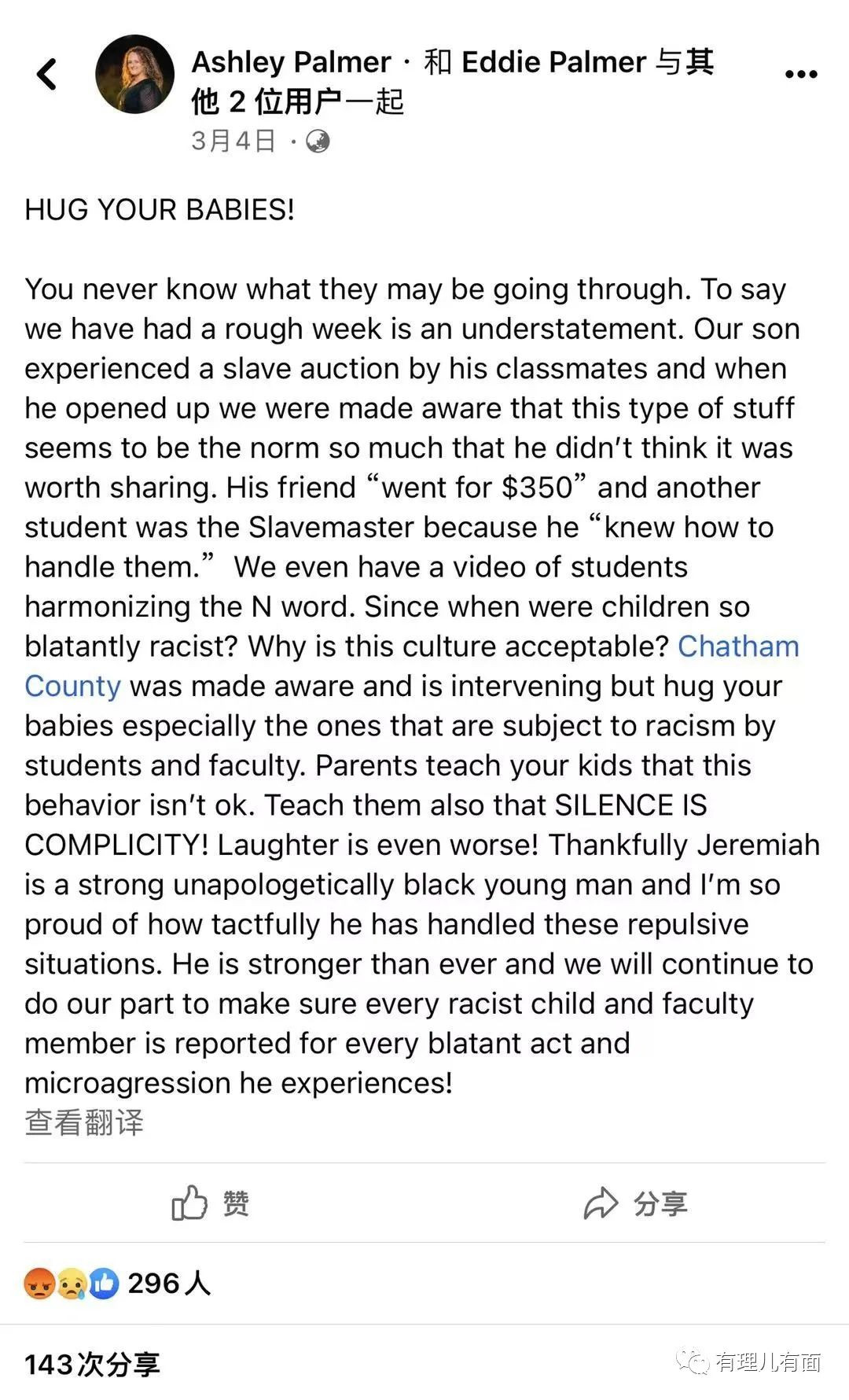 3月4日,美國北卡羅來納州一位名叫阿什麗·帕爾默的白人母親在社交平台發文稱,自己的黑人混血兒子“被當奴隸拍賣了,他的同學出價350美元,另一個學生充當奴隸主的角色,因為他‘知道如何處理他們’。”