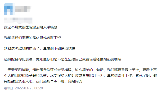 一天天採和核酸,請出示身份證或者採樣碼,這麼簡單的一句話,我們都要重複上千次,要看上百個人的口腔和嗓子眼和舌苔,忍受很多人的吐痰或者想嘔吐行為,真的情緒性工作,累死了啊,做完核酸趕緊走人吧,我們還能早點下班,真給閒的