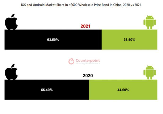 Counterpoint Research 的最新研究報告,2021 年,中國 600 美元(約 3828 元人民幣)以上價位的安卓智能手機市場份額從 2020 年的 44.6% 縮水至 2021 年的 36.5%,凸顯了國內廠商難以搶佔華為留下的高端市場,如何看待這一現象?