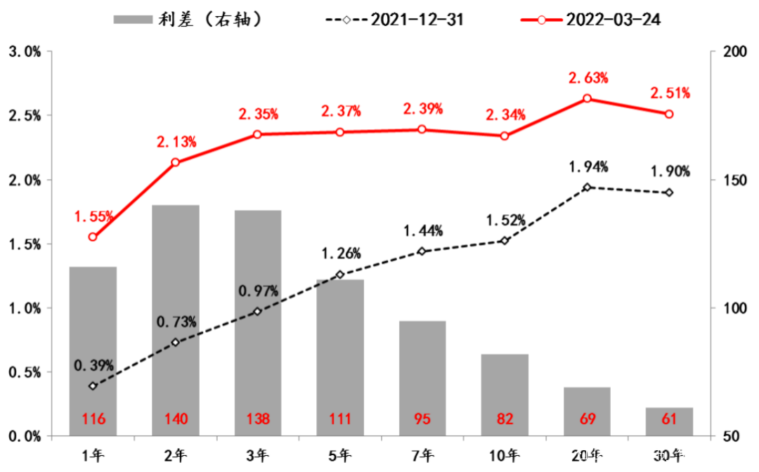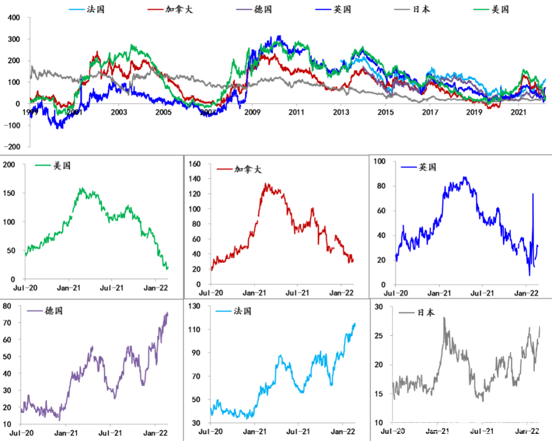 另外,之前主要發達經濟體國債曲線形態基本都是跟隨美債曲線同步同向變化,但是本次美債收益率曲線變化並未帶動其他發達經濟體曲線同步變化。例如10年期德債與2年期的利差由年初的40Bps升至45Bps,10年期法債與2年期的利差由年初的80Bps升至115Bps,即便是同為英語系國家的英國也顯示出分化態勢,可見當前各國國債期限利差分化的格局,反映出本輪全球加息潮對全球和各國經濟影響的複雜性。