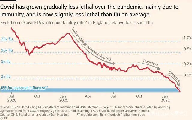 一份基於英國人口數據的報告明確指出,對英國絕大多數人來説,高水平的免疫力和奧密克戎變種嚴重程度的降低,使得新冠的致死率低於流感。