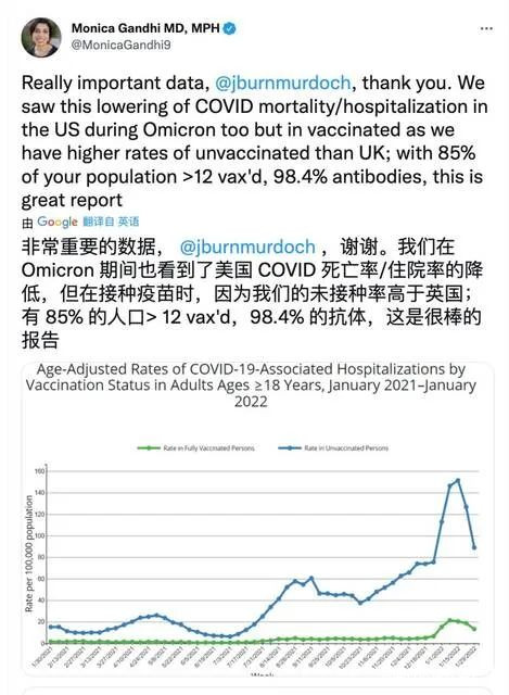 加州大學舊金山分校醫學教授莫妮卡·甘地(Monica Gandhi)博士説,英國的報告引用了一個“非常重要的數據”。甘地進一步指出,在奧密克戎這波疫情期間,美國的新冠死亡率和住院率也出現了顯著下降,但由於美國的疫苗接種率偏低,現在的死亡率仍然為英國的兩倍,德國的四倍。