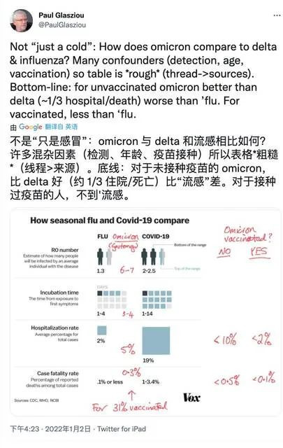 格拉齊烏博士利用來自美國疾控中心(CDC)、世衞組織和NCBI的數據,從感染率、潛伏期、住院率和病死率等幾個方面比較了流感和新冠的數據。 通過粗略的計算,格拉齊烏博士表明,在接種疫苗的人羣中(使用南非最初出現奧密克戎疫情的豪登省的數據),奧密克戎的病死率不到0.1%——低於季節性流感的病死率。然而,在未接種的人羣中,奧密克戎的病死率最高可達近0.5%,這仍然遠高於流感。 他説,“結論是,對於未接種疫苗的人來説,奧密克戎比德爾塔好(住院死亡率約1/3),比流感更嚴重。對於接種過疫苗的人來説,嚴重程度不如流感。”