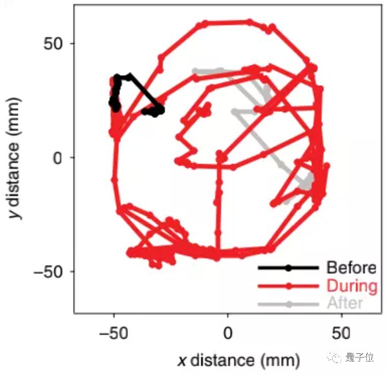 黑線代表照射之前的小鼠活動軌跡,紅線代表照射中,灰線代表照射結束後。