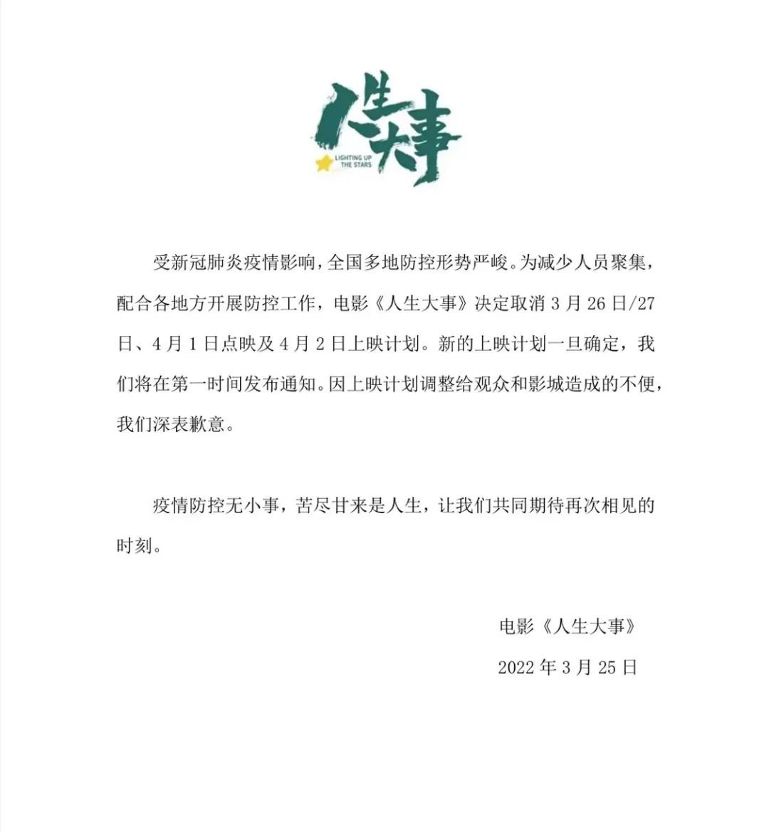 3月25日下午兩點半,@電影人生大事發布了一條微博:“疫情防控無小事,苦盡甘來是人生。”由此宣佈影片《人生大事》退出清明檔,重新上映時間未定。
