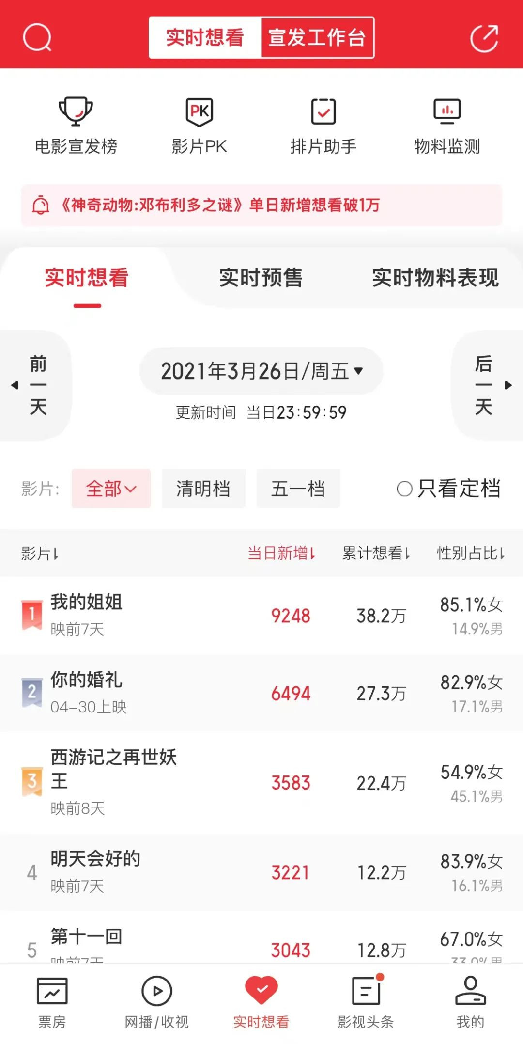 在想看人數上,2021年映前七天清明檔的想看人數累計超過85萬人,打破了23項清明檔影史紀錄的《我的姐姐》,映前七天想看人數已達38.2萬人。