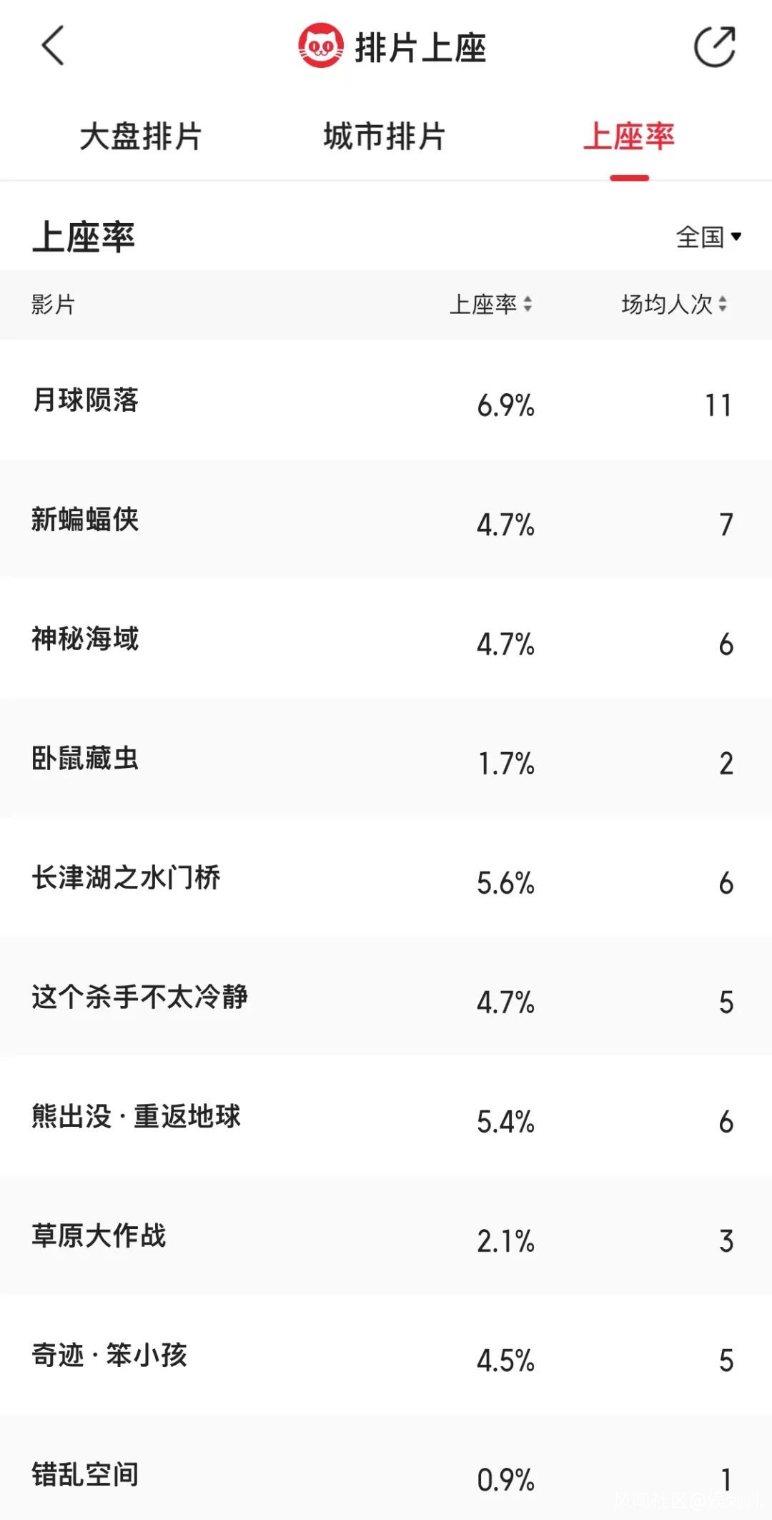 3月26日,貓眼專業版數據顯示,正在上映的《神秘海域》《新蝙蝠俠》《月球隕落》等十部影片,**全國上座率均未超過7%;**驚悚片《錯亂空間》上座率僅有0.9%,場均人次僅為5。《新蝙蝠俠》上映首日上座率僅有4.7%,而2021年的3月26號,《哥斯拉大戰金剛》上映首日上座率達12.2%。