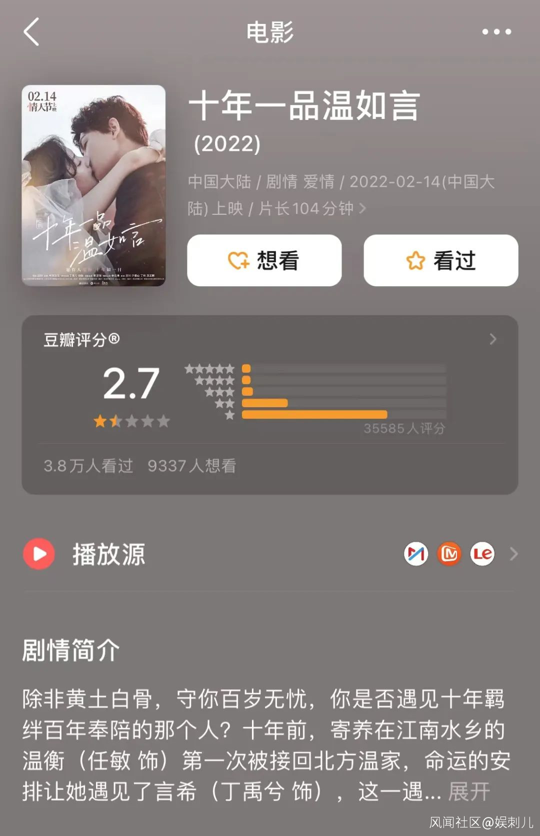 春節檔過後,情人節檔接踵而至,然而情人節檔的票房冠軍《十年一品温如言》,票房僅1.43億,豆瓣開分也只有2.2分,甚至被網友直接罵上熱搜第一。
