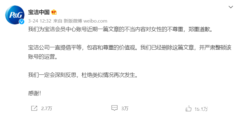 隨後,3月24日,寶潔中國就此事件發表官方道歉,登上微博熱搜。