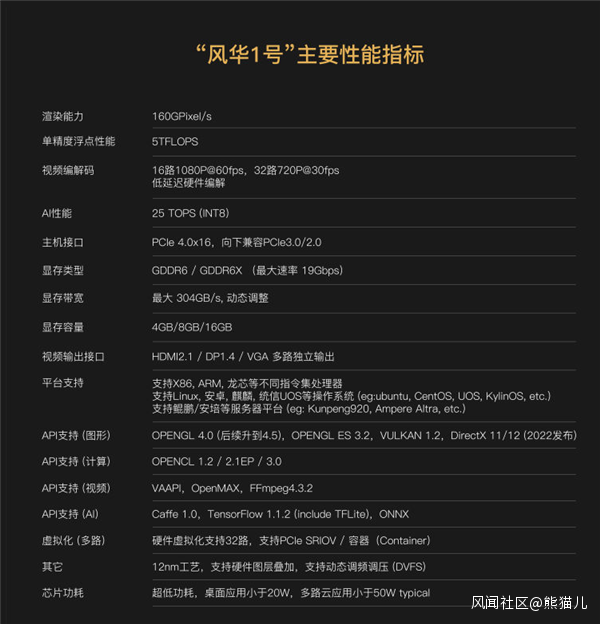 具體來看,風華1號A型卡FP32浮點性能5T FLOPS、渲染能力160G Pixel/s、AI計算為25TOPS(INT8)、編解碼能力:同時4路 4K60幀,16路1080P60,32路720P30。