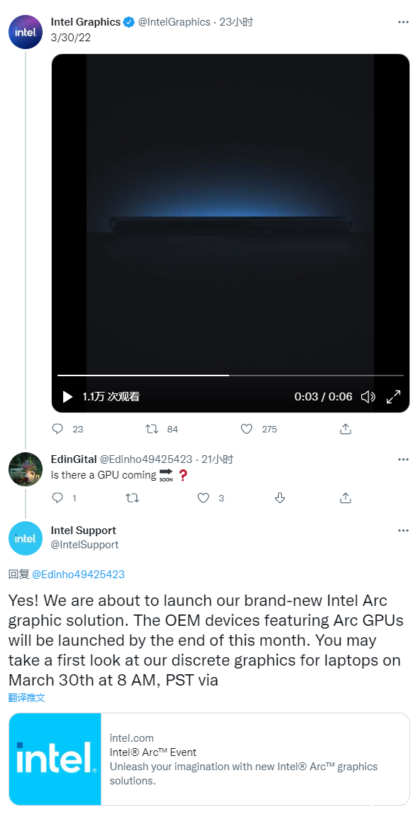 1、Intel確認,即將發佈全新的Intel Arc鋭炫顯卡,面向筆記本,具體時間為太平洋時間3月30日8點(北京時間3月30日23點)。