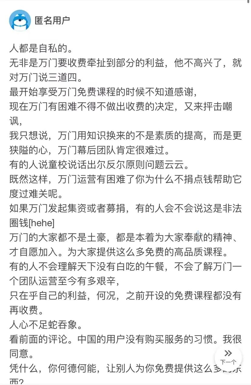 雖然從免費到付費的轉變引起了一些用户的不滿,但也有相當一部分用户表示理解和支持萬門,畢竟萬門初期是一個公益性質的平台,現在仍然保留了百分之八十的免費課程,他們認為,萬門開始向用户收費是不得已之舉,這也是保持長期可持續發展的做法。