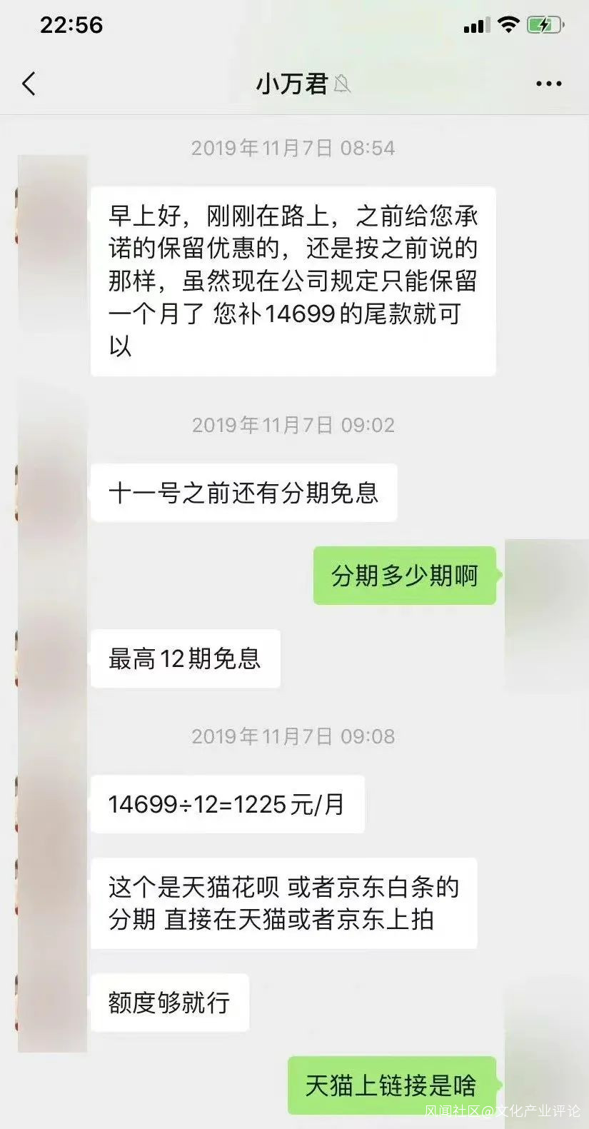 **在銷售課程上,萬門大學更是展現了自己的“瘋狂”。**由於銷售業績是考核的唯一標準,同時銷售課程的提成很高,萬門大學的銷售客服使出了渾身解數來推銷課程,學員不得不被他們微商廣告般的課程信息刷屏,還要抵抗客服們時不時的“騷擾”與“話術”。一些本身沒有消費數萬元VIP課程能力的學生,被客服勸説使用花唄、京東白條等提前消費的工具購買課程。在萬門大學暴雷之後,這些被迫提前消費的學員陷入了絕望的境地,課是聽不成了,分期的錢卻還要還。