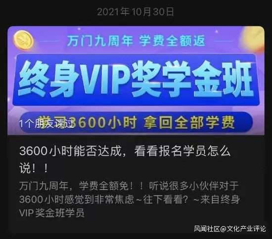 傳銷式賣課的問題也是如此。萬門大學急功近利地收取用户的費用,卻沒有做好相應的保障措施,對終身VIP用户的宣傳中提到可以免費學習新增課程,但實際情況是,平台並沒有及時更新後續配套課程。付費用户的後續服務,往往沒有得到保障。但這些問題,都在萬門販賣的學習焦慮、客服的催促和銷售話術中,被上頭的用户們無視了。萬門通過這種方式做出了“輝煌”的業績,但盛名之下,其實難附,命運早為萬門大學標好了應該付出的價格。