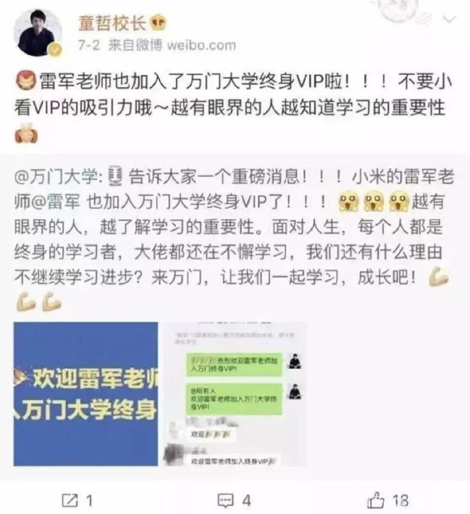 萬門大學另一讓學員詬病的問題在於瘋狂營銷和傳銷式賣課。萬門大學處處都有營銷點,創始人童哲的經歷可以大書特書,師資與課程質量也可以大書特書,連小米的雷軍也免不了被碰瓷成為萬門營銷的材料。