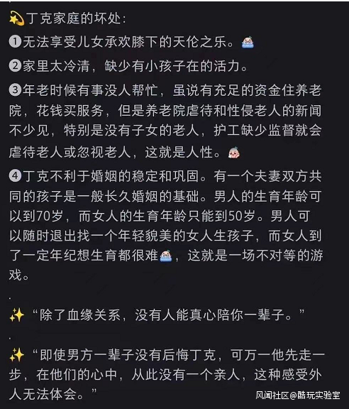 有人故意放大婚姻生活的不幸、強調生孩子是巨大的拖累,營造出**“凡是結婚、生子的人都是痛苦的”**討論氛圍。
