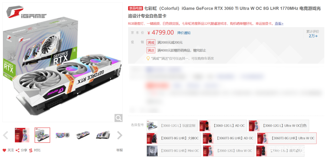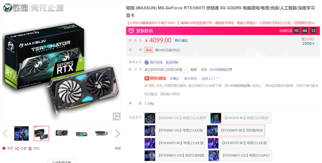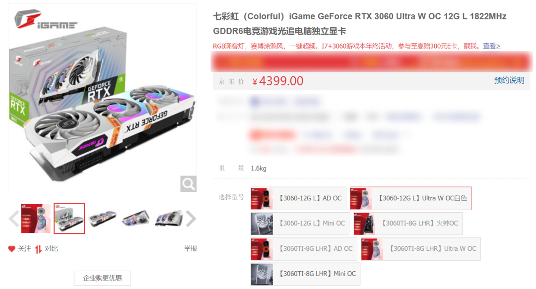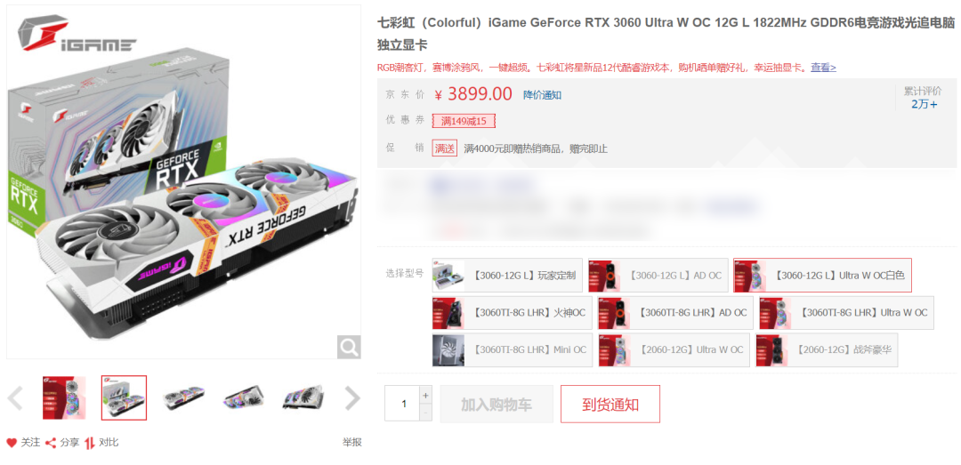 RTX 3060 作為一張中端定位的顯卡,當時它在官方店鋪的價格大概在 4399 左右,超出 2499 指導價將近兩千塊錢,而且這還是它搞活動時的價格: